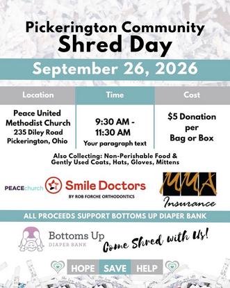 Thank you to everyone in our community who helped promote and participate in our 10th annual Shred, Food and Clothing drive, held on September 27, 2025. Thanks to your amazing generosity, we collected 33 coats to donate to the children in our community as well as several bags of food (125 packages of human food, 48 cans of cat food, and 28 packages of Size 4 diapers) to donate to PCMA Food Pantry. We raised cash donations totaling $4,065.00, all of which we donated to the Bottoms Up Diaper Drive who supplies disposable diapers to families in need in the Pickerington Community as well as Fairfield County and Central Ohio. We are deeply grateful to our community for another hugely successful year!